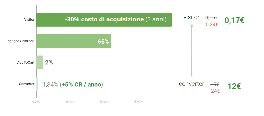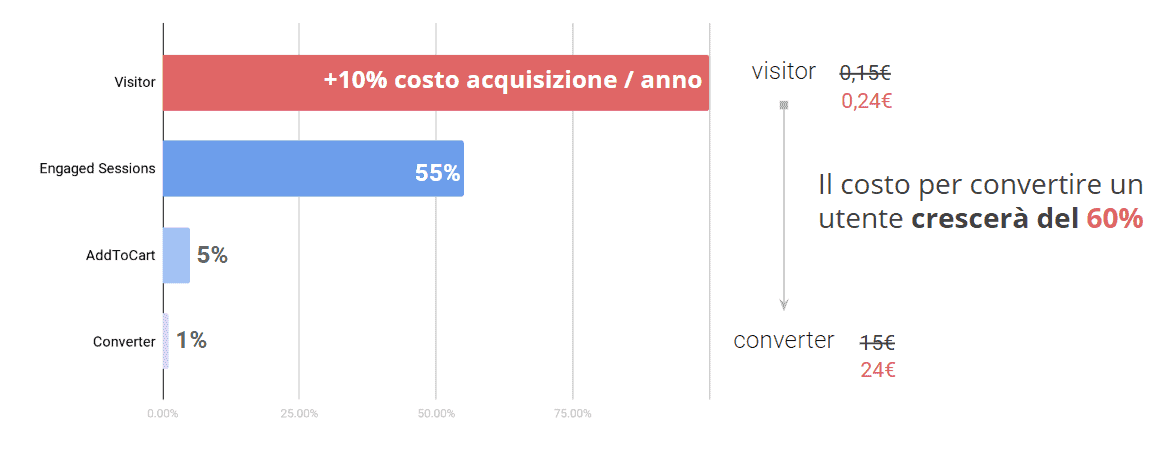 Nel lungo periodo questo approccio potrebbe portare ad una diminuzione del ROI: se non ottimizziamo il nostro funnel, il costo degli accessi al nostro sito aumenterà anno dopo anno, aumentando di conseguenza il nostro costo per conversione, generando inefficienza.