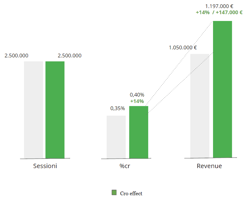 Tornando quindi all'esempio iniziale, con un'attività di CRO portata avanti nel tempo, potremo: