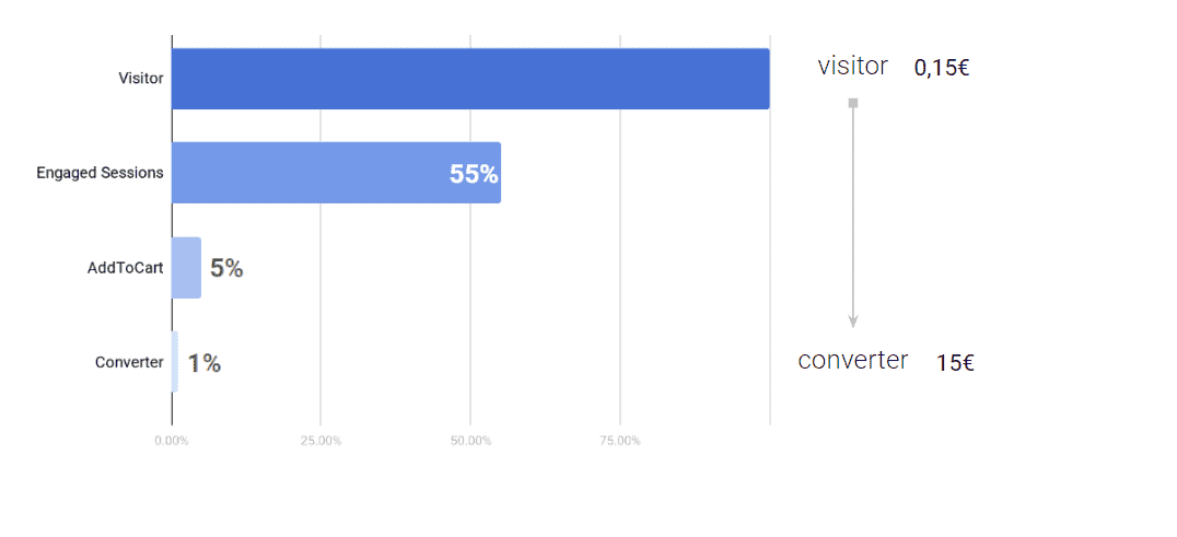 Immaginiamo di avere attualmente un costo per visitatore di 0,15€ e che l'1% di questi converta, avremo quindi un costo per acquirente di 15€