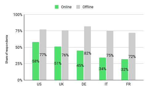 Nonostante il generale ritorno nei negozi fisici, nelle principali country europee il ruolo dell'e-commerce continua a mantenere un ruolo importante nella shopping experience, registrando percentuali più alte nel Regno Unito e negli USA: in entrambi i paesi il gap tra acquisti tramite canali digitali e fisici da parte dei consumatori si fa sempre più sottile.