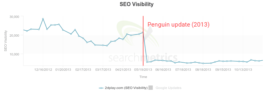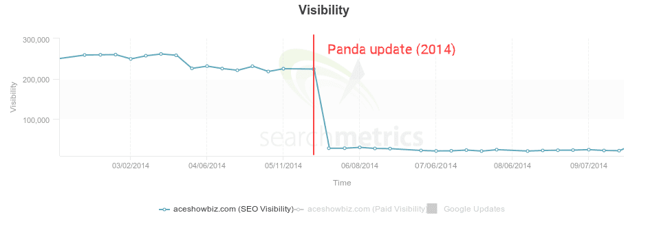 Uno dei primi e più importanti aggiornamenti rilasciati è stato il Google Panda Update che, a partire dal 2011 e in più riprese, ha scombussolato le SERP internazionali. A essere presi di mira da questo aggiornamento sono stati i siti che presentavano qualità scadente, come duplicazione di contenuto o "thin content" cioè contenuti scarsamente informativi e poco utili per l'utente. Di seguito il crollo di traffico di un sito colpito dal Panda Update: