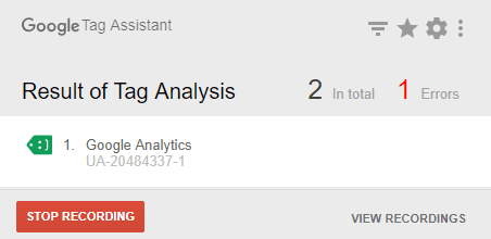 Se l'estensione ti segnala un'etichetta verde (primo caso), allora significa che i tracciamenti sono settati correttamente; se, al contrario, l'etichetta segnalata è di colore rosso (secondo caso), allora c'è qualche problema di tracciamento tale per cui Google Analytics non è in grado di ricevere alcuna risposta dal tuo sito.