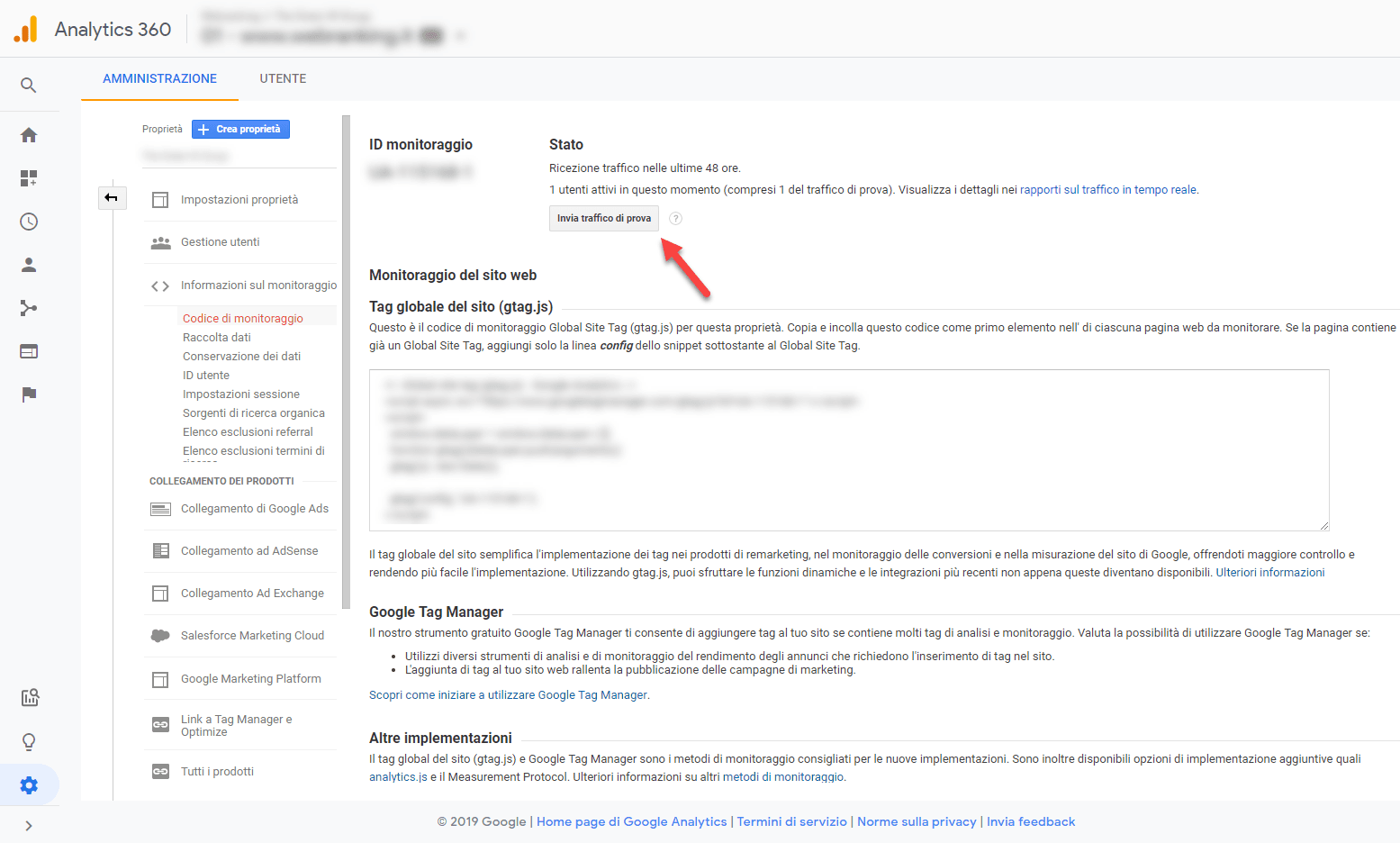 Accertarsi che il codice di monitoraggio della tua property sia settato correttamente su Google Analytics è molto semplice: apri la sezione Amministratore, cerca la voce Informazioni di monitoraggio > Codice di monitoraggio nel pannello della property e clicca il pulsante Invia traffico di prova (una nuova finestra si aprirà mostrando l'home page del tuo sito):