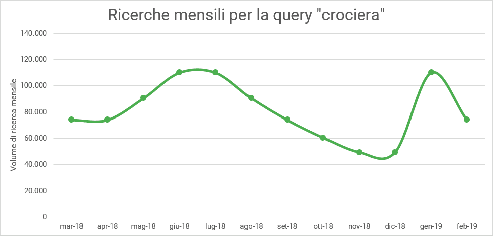 Prendiamo, ad esempio, il settore delle crociere. L'interesse delle persone verso un viaggio in crociera non è costante durante tutto l'anno ma, tipicamente, si fa più forte in periodi specifici, come a ridosso dei mesi estivi e a inizio anno. Questa tendenza ci viene confermata dall'analisi delle ricerche degli utenti sul periodo di un anno: