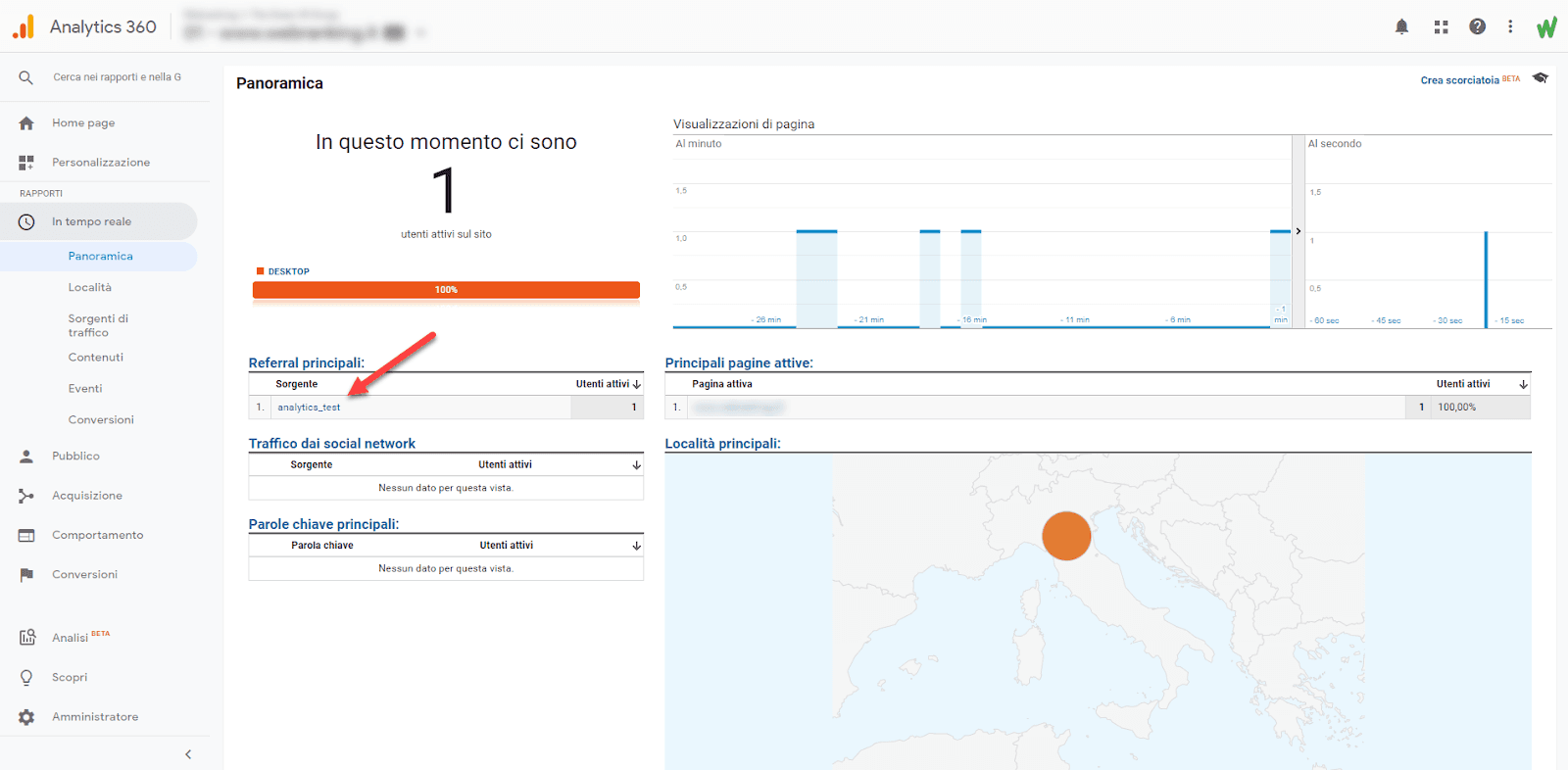 Ora, spostati nella sezione In tempo reale > Panoramica. Se il tracciamento è settato correttamente scoprirai un referral con sorgente analytics_test:
