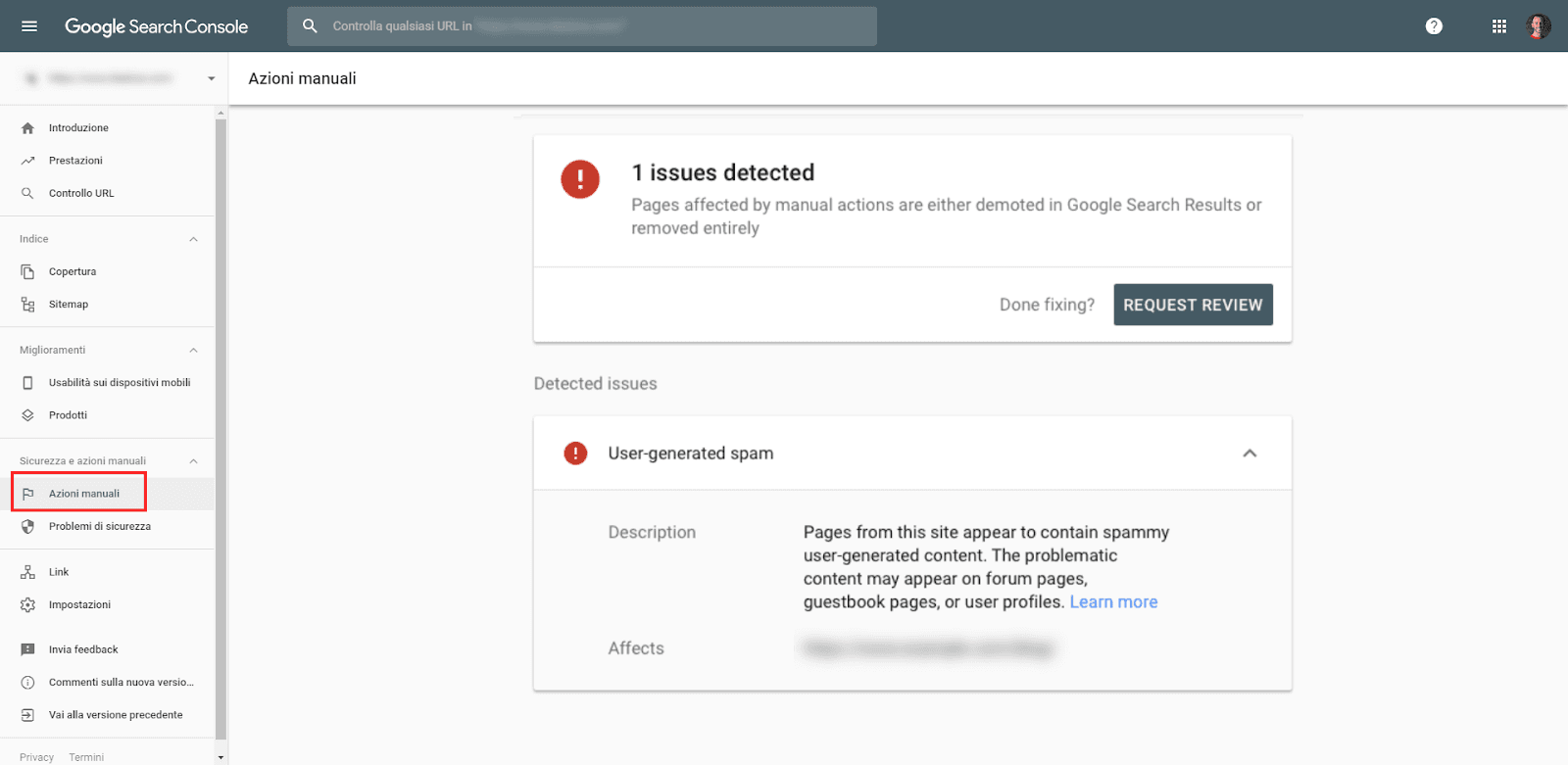 Il modo più rapido e certo per capire se il tuo sito è stato bersaglio di un'azione manuale consiste nel verificare la presenza di una segnalazione all'interno di Google Search Console: