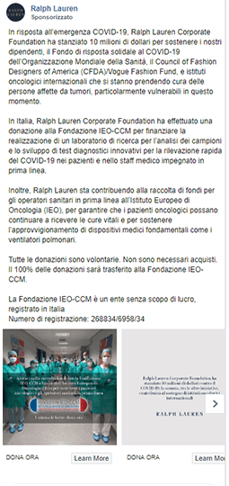 Sempre questo brand, durante la settimana successiva, ha utilizzato in formato carousel e story un contenuto volto a incentivare le donazioni a favore della lotta al Covid-19. Cliccando sulla CTA, si atterrava su una landing page del sito Ralph Lauren che dava la possibilità di effettuare delle donazioni.