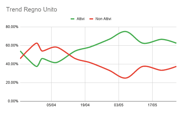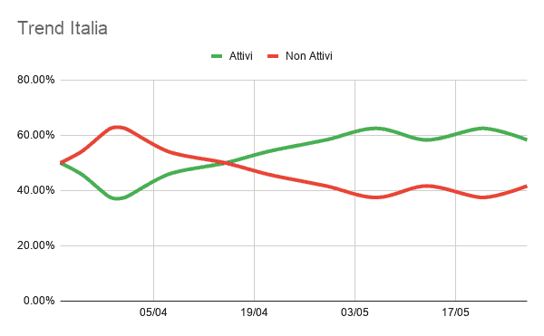 Si nota subito come la country che ha risentito di meno della crisi da Covid-19, tra quelle prese in analisi, sia stata la Germania. Dopo un primo periodo nel quale i brand inattivi con inserzioni su tale country superavano il 50%, la Germania è stato il primo mercato nel quale i brand hanno ripreso a comunicare lato paid. Mentre la country che ne ha risentito maggiormente è la Spagna. Dal grafico è evidente come già dal 12 Aprile la maggior parte dei brand abbia ripreso a essere presente con inserzioni paid sui canali social; complessivamente è evidente come per quattro delle sei country analizzate (Italia, Stati Uniti, Regno Unito e Germania) la terza settimana di aprile segni un punto di svolta. Infatti proprio durante questo periodo che il numero dei brand attivi con advertising su queste country, supera quello dei non attivi. Trend che rimarrà costante fino alla fine di maggio.