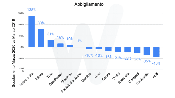 - discorso diverso per le donne: sebbene l'acquisto degli accessori diminuisca di pari passo alla percentuale registrata dagli uomini (-16%) e le calzature di un -13%, è l'abbigliamento a registrare l'unico dato in positivo +16%, dovuto all'elevato aumento registrato dalle categorie Intimo, Intimo notte e Tute.