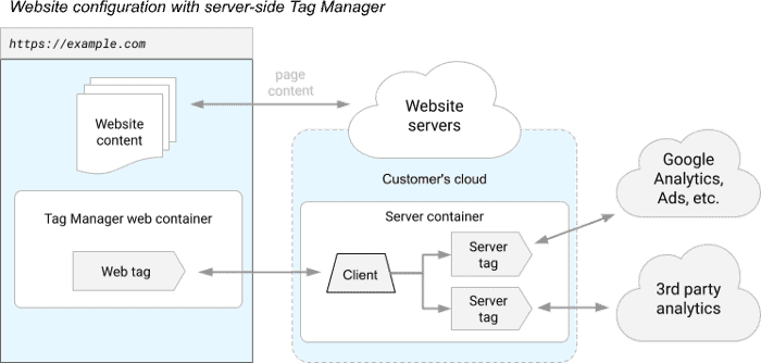 Il Server Side Tagging non ribalta completamente il meccanismo appena descritto ma inserisce uno strato ulteriore che permette di spostare i tracciamenti dal sito al server proprietario. In questo modo viene alleggerito lo strato visibile al cliente e inglobati tutti i tracciamenti in un ambiente chiuso e sicuro, il quale si occuperà in autonomia di gestire le richieste, trasformarle in eventi e inviare i tag ad essi collegati alle piattaforme di riferimento. Nella seguente immagine viene presentato il funzionamento del SST proposto da Google, dove si vede la parte centrale composta dal server, il cui funzionamento è descritto nel paragrafo precedente.
