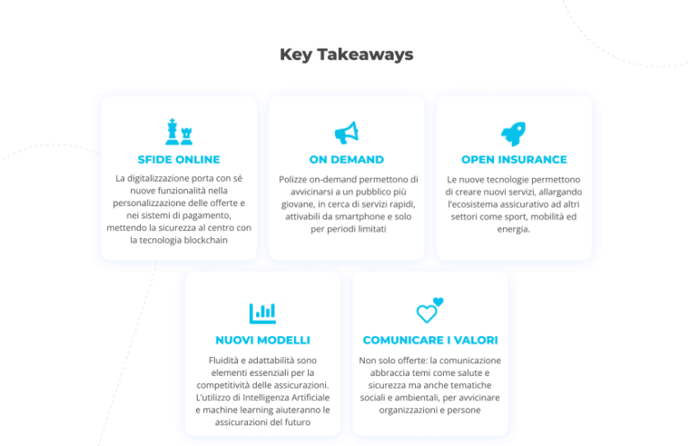 THINK INSURANCE! individua i macro-trend delle assicurazioni del futuro in cinque aree: sfide online, on demand, open insurance, nuovi modelli e comunicare i valori.