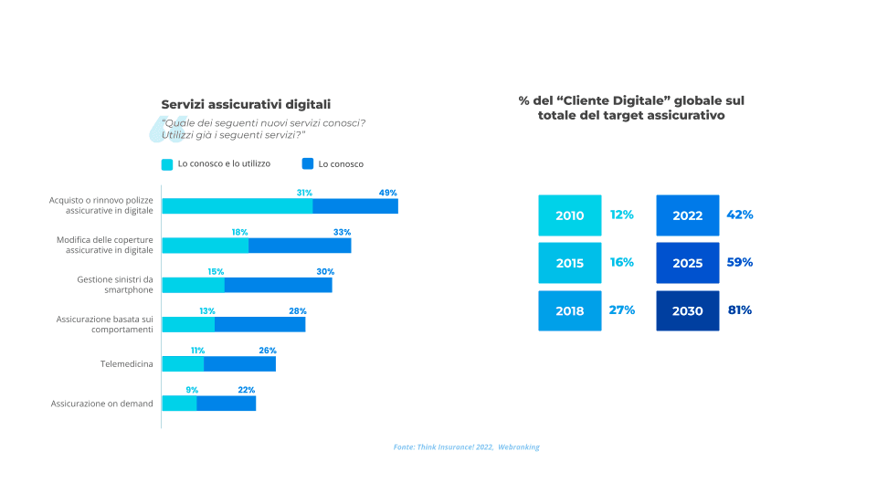 L'evoluzione delle aziende segue le nuove necessità dei clienti che si dimostrano anch'essi sempre più digitali: l'acquisto di polizze assicurative online, nel 2021, è utilizzato dal 31% del campione intervistato (con proiezione al 47% per il 2022) e conosciuto dal 49%, con proiezione al 78% per il 2022.