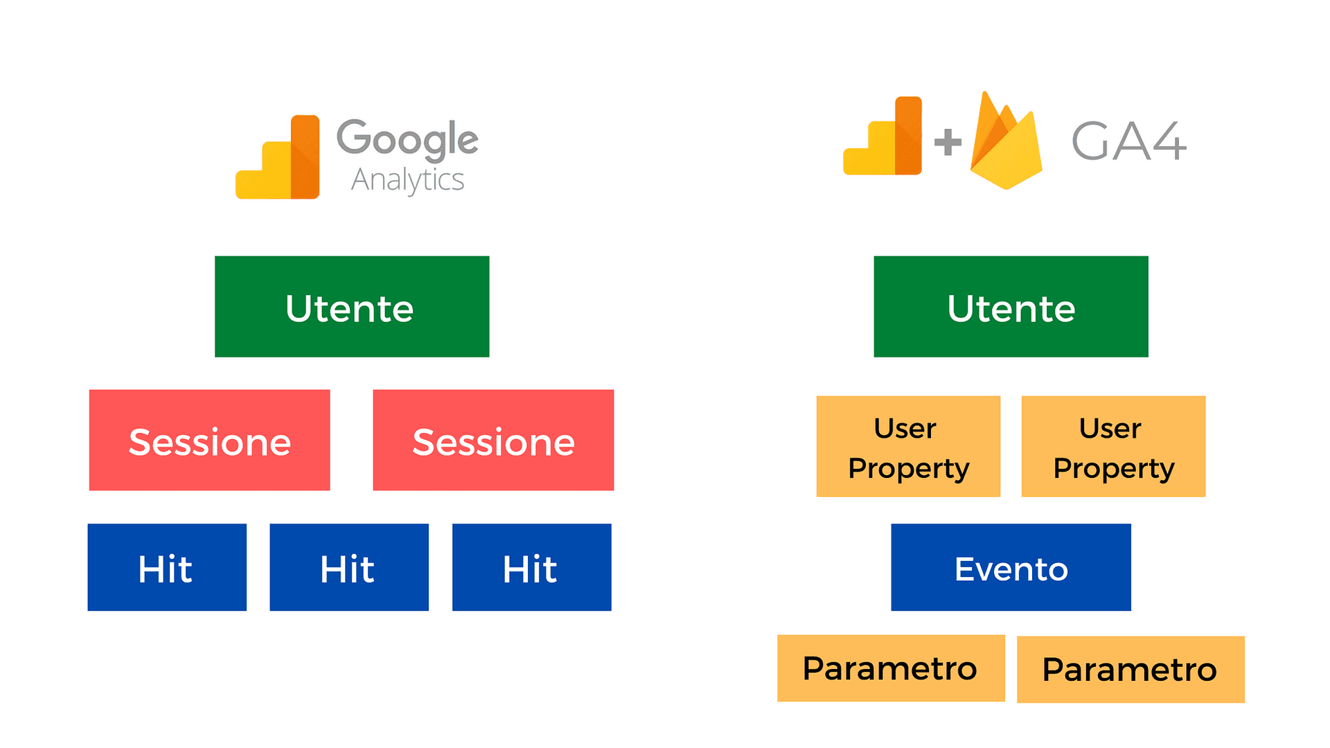 L'attuale modello prevede una gestione su tre livelli: utente — sessione — evento, in quello nuovo le sessioni non esistono (quasi) più, il focus delle analisi dovrà evolversi e passare da session centric ad event centric. Questa evoluzione porta con sé un nuovo modo di osservare e analizzare i dati e prendere decisioni inerenti al business. Al momento sembra che non sarà possibile migrare le attuali property Universal Analytics adattandole a questo nuovo data model ma sarà necessario crearne uno ex novo.