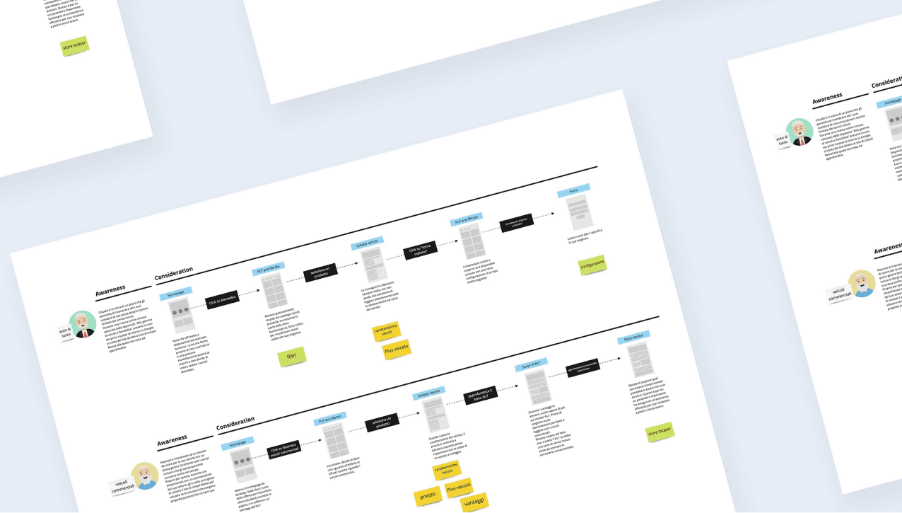 Durante questa fase, ci siamo concentrati su un obiettivo fondamentale: tradurre le esigenze specifiche degli utenti in requisiti concreti. Attraverso un'analisi approfondita del nostro pubblico di riferimento e dei loro intenti di ricerca, abbiamo elaborato e declinato le personas di UnipolRental, profili rappresentativi per ogni cluster di utenti. Per ogni personas, sono stati progettati percorsi personalizzati, dalle prime interazioni, alla fase di discovery fino a mappare la customer experience completa sul nuovo sito UnipolRental. Le customer journey, che si sono concretizzate in percorsi utente specifici ci hanno permesso di raccogliere preziose informazioni sulla strategia di ottimizzazione e sull'opportunità di introdurre nuove funzionalità.
