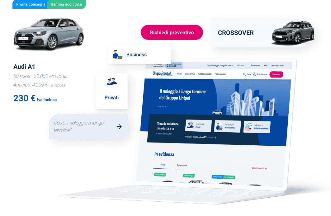 UnipolRental è il più grande player a capitale interamente italiano del mercato del Noleggio a Lungo Termine. Nella co-progettazione del nuovo sito, la richiesta principale del cliente riguardava la realizzazione di un'esperienza mobile ottimizzata e user first. Il punto di riferimento è sempre stato l'utente, il suo comportamento e le sue esigenze, così da garantire la migliore navigazione possibile in termini di usabilità e soddisfazione. Il secondo obiettivo invece era favorire la fidelizzazione e la percezione di affidabilità, creando una digital brand identity distintiva e riconoscibile.